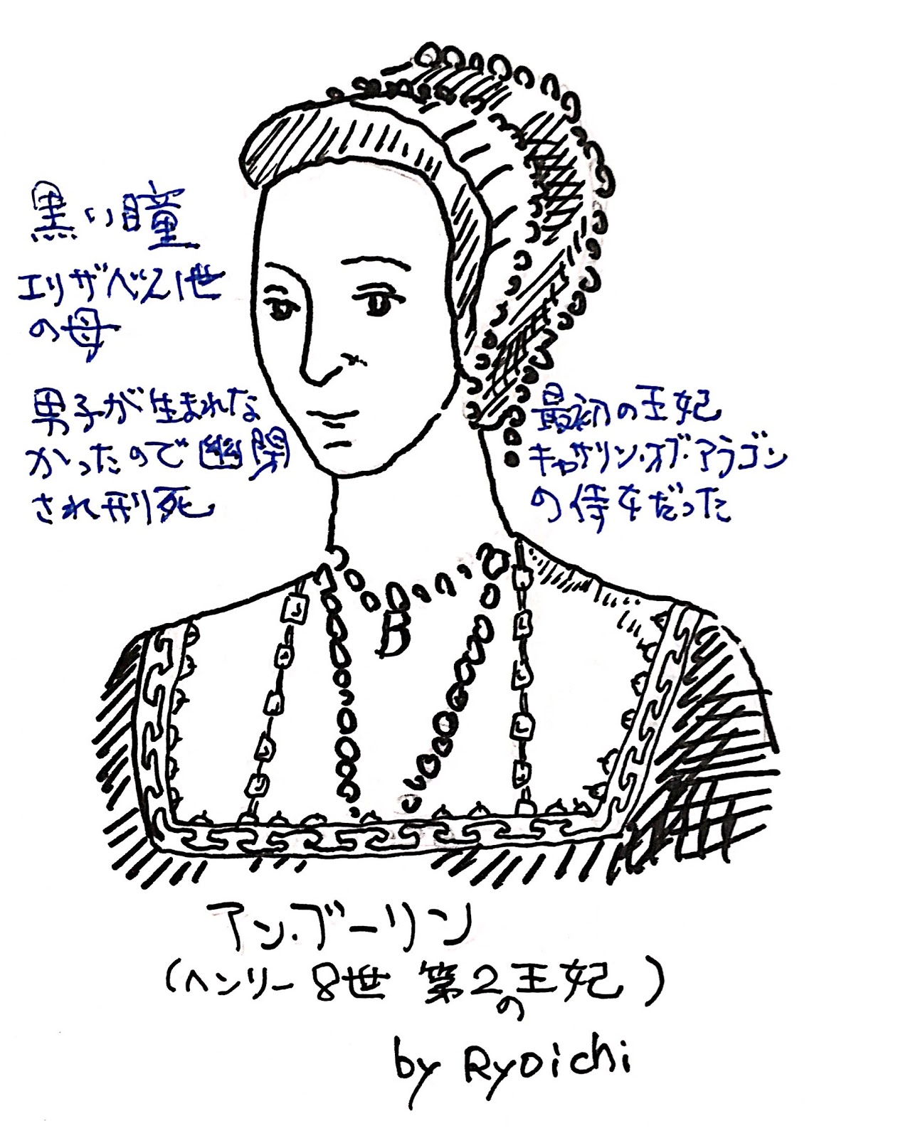 2人目  :アン・ブーリンキャサリンの侍女で黒い瞳の美人はエリザベス1世の母(ちなみに現在のイギリス女王はエリザベス2世)です離婚の後、ロンドン塔に幽閉されあげくは刑死。生首が蝋人形館に展示されていてイギリス国民には有名な人らしい。ロンドン塔で幽霊が出るというのは有名な話